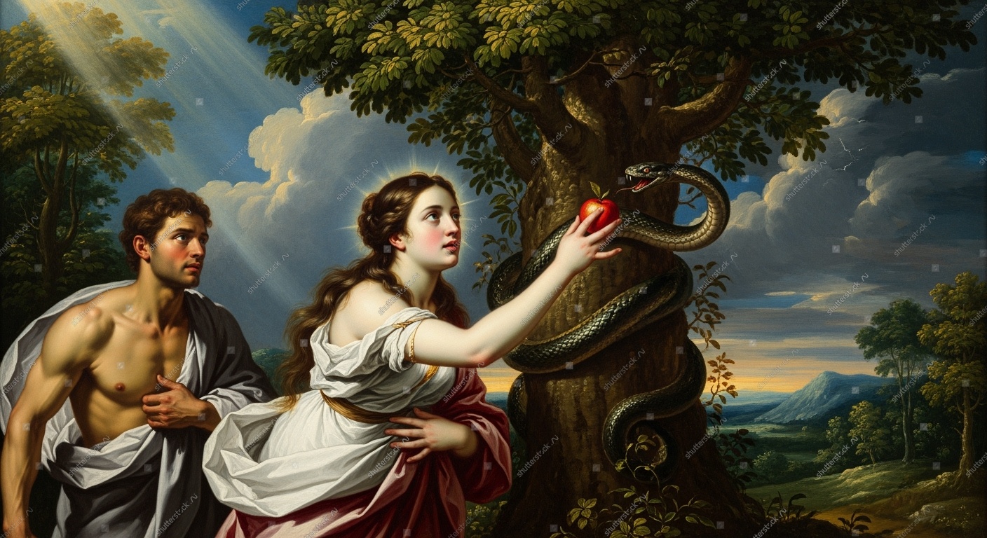 Eva wordt door de slang verleid toch van de appel te eten en haalt op haar beurt Adam over dat ook te doen. God straft hen door beiden uit het paradijs te verbannen. De vrouw zou er aldus voor verantwoordelijk zijn dat wij, mensen, nu op de aarde buiten het paradijs moeten leven en dus ook moeten lijden. Hadden we als mensen in het paradijs kunnen blijven, dan was ons dat allemaal bespaard gebleven en hadden we zonder leed, pijn, oorlogen, enzovoort, vrolijk en in harmonie in het paradijs geleefd.